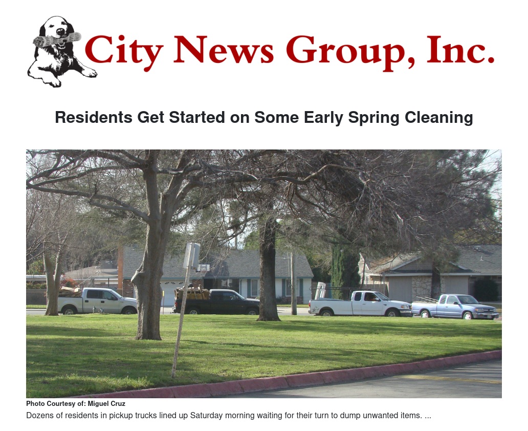Dozens of trucks lined up early Saturday at Wildwood Park in San Bernardino for the monthly Residential City Clean-up Day, which are held the last Saturday of each month. These events give residents the opportunity to get rid of household refuse such as yard waste, old mattresses, televisions, furniture, and other waste at localized dumps, free of charge. After the event, the waste collected is taken to material recovery facilities (MRFs) where it is sorted for proper disposal or recycling. Harmful chemicals and construction materials are not accepted.