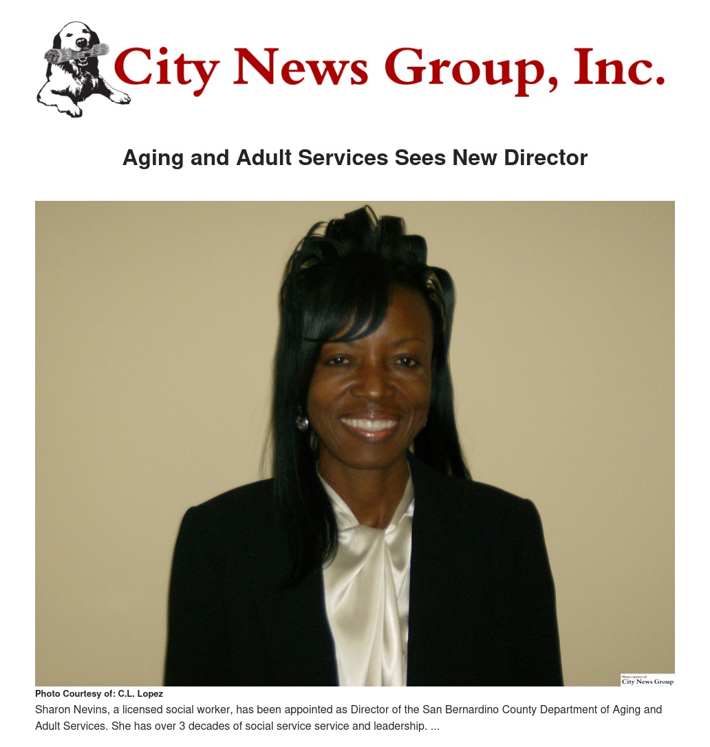 SAN BERNARDINO>> Sharon Nevins, a licensed social worker, has been appointed as Director of the San Bernardino County Department of Aging and Adult Services.