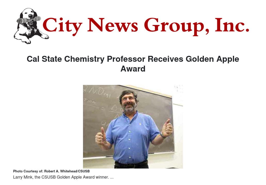 “There were many excellent nominees, but Dr. Mink stands out due to his exceptional instruction and significant contributions related to teaching across the broader community,” wrote Amanda Wilcox-Herzog, chair of the Golden Apple Selection Committee and herself a winner of the award in 2011-2012. Mink had previously been nominated for the Golden Apple twice and was named Professor of the Week by the CSUSB Kappa Delta Sorority, Zeta Chapter.