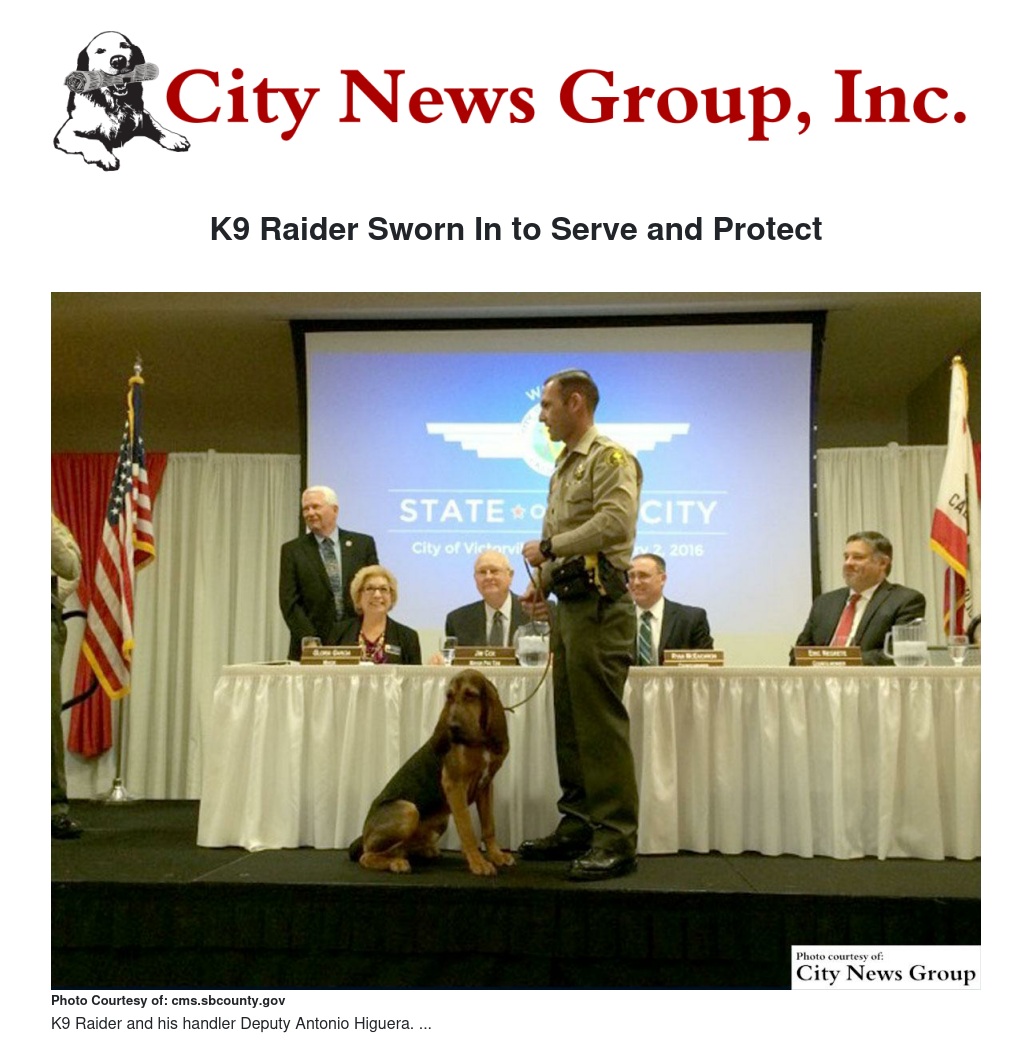 Raider, a Bloodhound trained in tracking and trailing, along with his handler, Deputy Antonio Higuera, will be fundamental in locating missing persons and suspects. Deputy Higuera and K9 Raider completed training that consisted of tracking and running sent trails in both rural and urban areas. Together they will be essential to the safety and security of the city of Victorville.