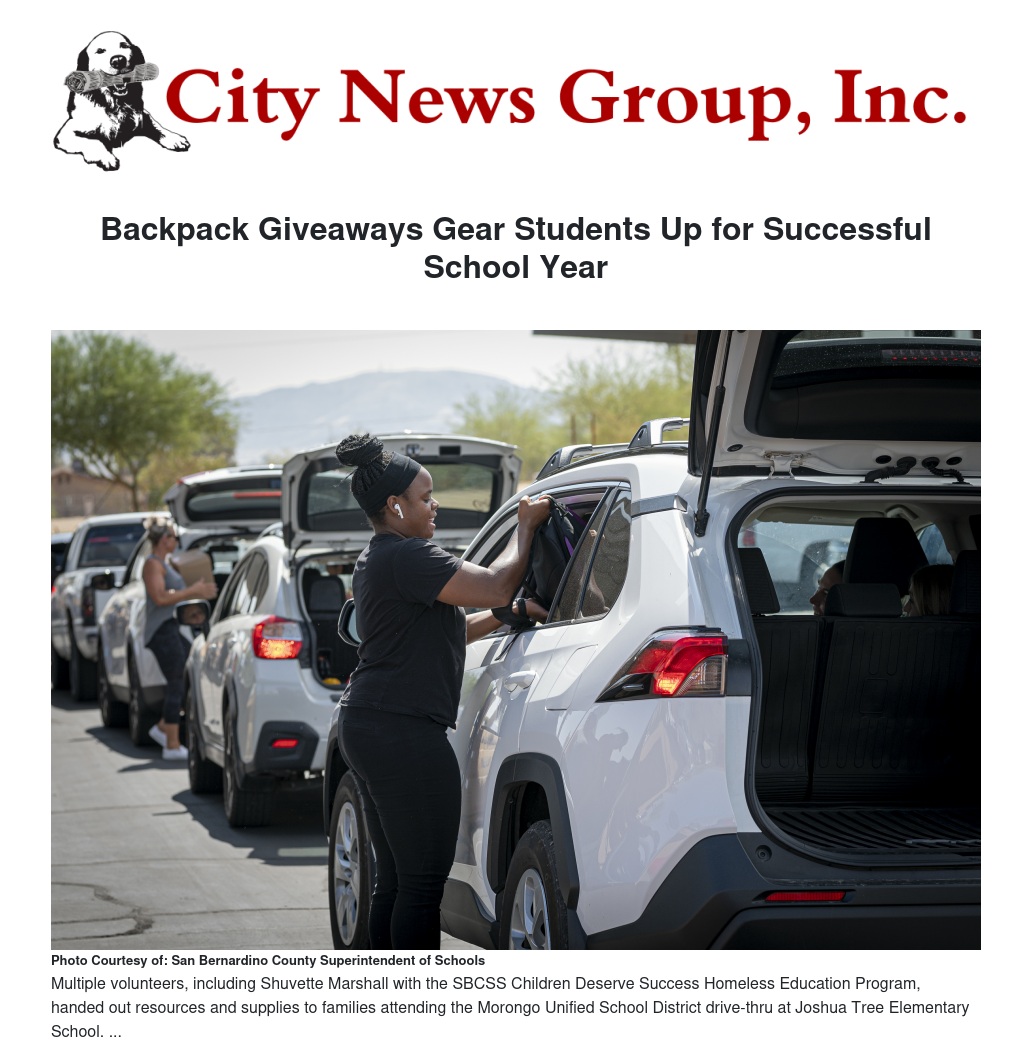 San Bernardino County Superintendent of Schools (SBCSS) partnered with various community groups to hold four backpack giveaways across the county, distributing more than 10,000 backpacks to students pre-Kindergarten through grade 12.