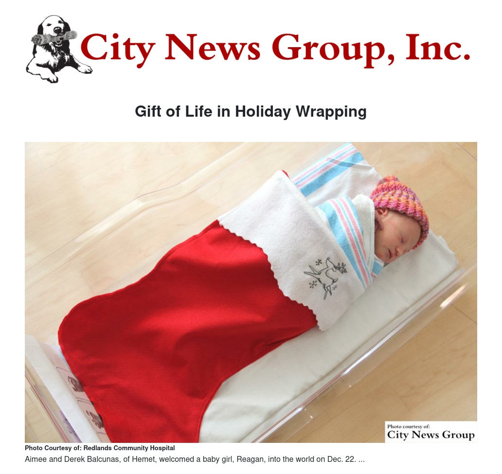 During the month of December, the Redlands Community Hospital partnered with the Redlands Sewing Center continued an 83-year-old tradition for the holiday season. Since 1930, the Linen Committee, now known as the Sewing Committee, comprised of hospital volunteers, have wrapped babies born in December in holiday stockings as they head home for the first time.
