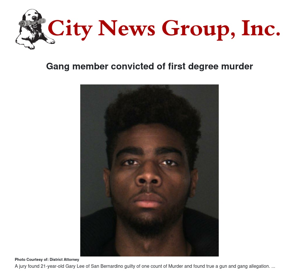 A jury found 21-year-old Gary Lee of San Bernardino guilty of one count of murder and found true of a gun possession and gang allegation.