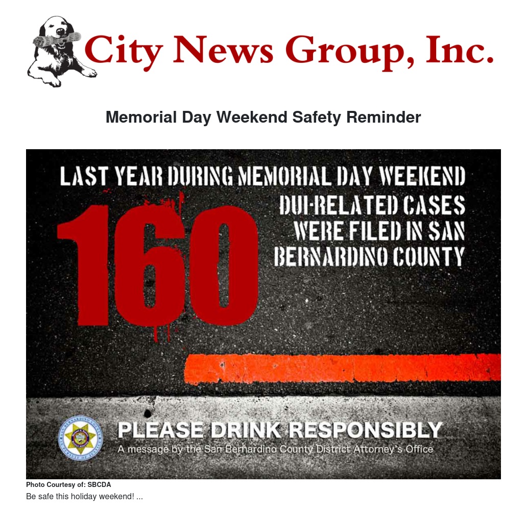 • Last year, during Memorial Day weekend, the San Bernardino County District Attorney’s Office filed 160 DUI-related cases across the county.
