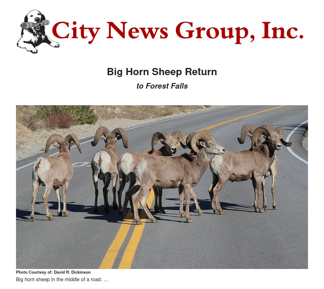 Big horn sheep are back in our local mountains and have definitely made their presence known around Forest Falls. Drivers on Highway 38 should be watching for them, especially near the intersection of Highway 38 and Valley of the Falls Drive. Some members of the herd are being a bit careless and have been seen wandering out onto the highway.