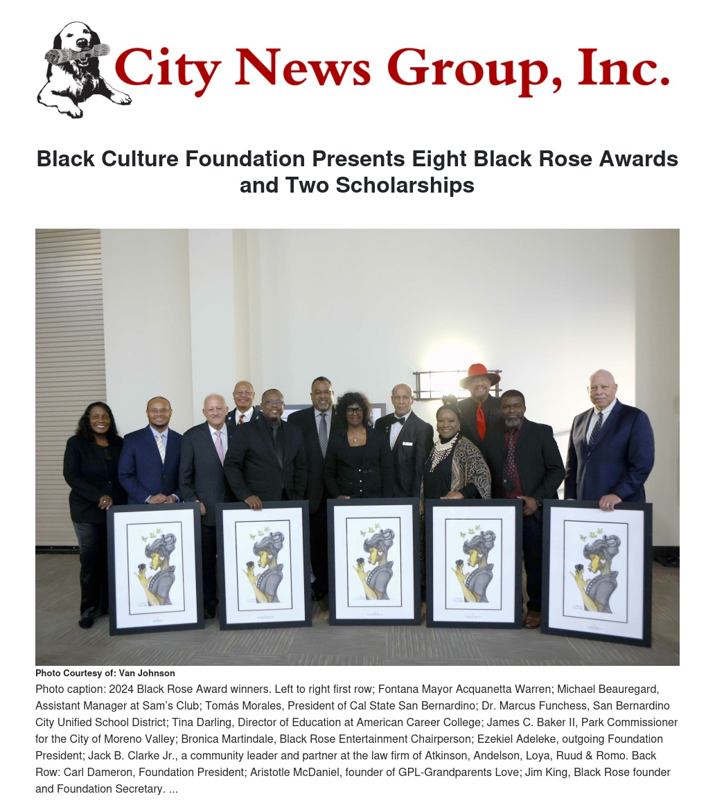 Black Rose Award winners include City of Moreno Valley Park Commissioner James C. Baker II, Sam’s Club Assistant Manager Michael Beauregard, Atkinson, Andelson, Loya, Ruud & Romo Partner Jack B. Clarke Jr., American Career College Director of Education and New Hope Missionary Baptist Church Nursing and Health Ministry Chair Tina Darling, San Bernardino City Unified School District Assistant Superintendent of Human Resources Dr. Marcus Funchess, GPL-Grandparents Love Founder Aristotle McDaniel, California State University San Bernardino President Tomás Morales, and Fontana Mayor Acquanetta Warren.