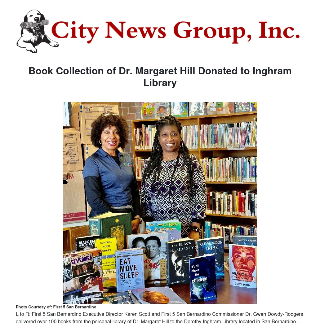 Over a hundred books from the library of Dr. Margaret Hill were donated this month to the Dorothy Inghram Branch Library in San Bernardino with the goal of continuing her life-long legacy of supporting literacy.