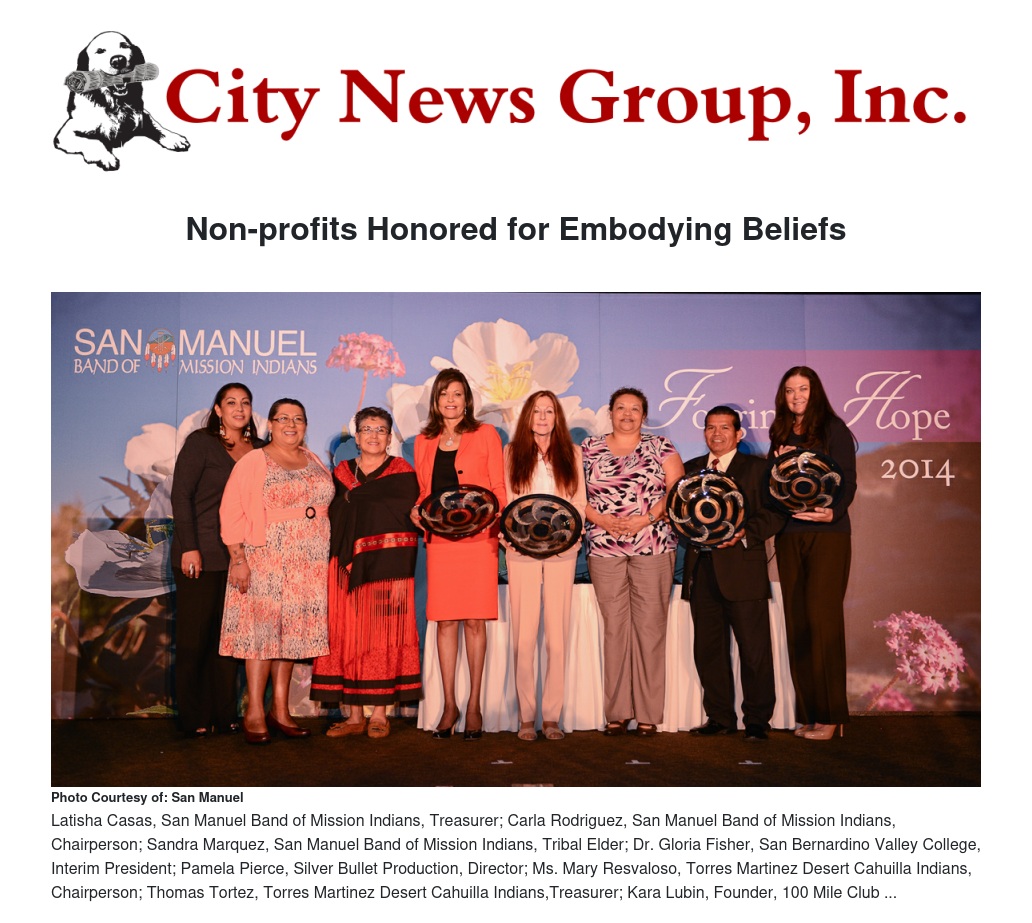 Creating positive and meaningful change in the community is never easy, but through strong partnerships with the San Manuel Band of Mission Indians, area and regional non-profit organizations have made huge strides. To recognize the achievements its nonprofit partners have made in the last year, the tribe honored four organizations that they believe have embodied and demonstrated the time-honored Serrano concept of Yawa’ – to manifest one’s beliefs through action – at the sixth annual Forging Hope Breakfast, recently held in San Bernardino. Organizations honored include the San Bernardino Valley College Foundation, 100 Mile Club, Torres Martinez Desert Cahuilla Indians and Silver Bullet Productions.