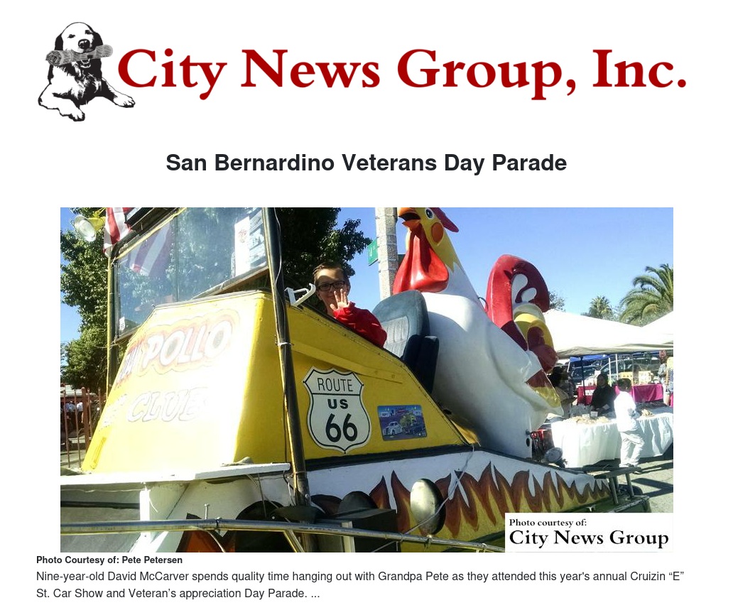 At 10 a.m. Saturday, Nov. 7, the parade was led by two of our city’s finest police motorcycle officers, followed by San Bernardino High School’s ROTC color guard and military vehicles from our San Bernardino Museum, Norton Military Museum and local VFW Inland Airborne Association jeep. Next came our supportive city council members and one of our faithful sponsors, Juan Pollo Chicken’s Dodge 2-door highway patrol car. E Street was lined with beautifully restored cars displayed by several car clubs.