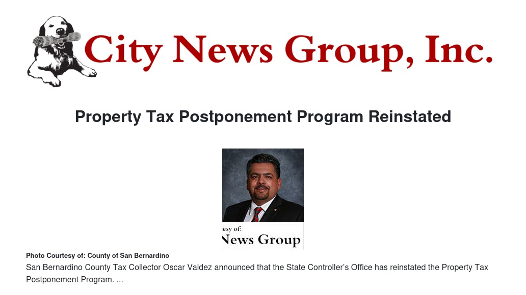 SAN BERNARDINO>> San Bernardino County Tax Collector Oscar Valdez announced that the State Controller’s Office has reinstated the Property Tax Postponement Program after it was suspended by the legislature in 2009 due to lack of funding.