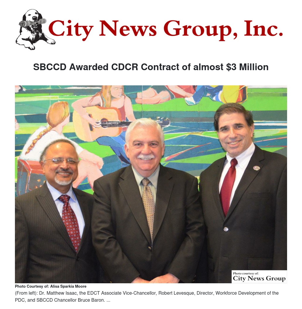 SAN BERNARDINO >> The Economic Development and Corporate Training (EDCT) Division of the San Bernardino Community College District (SBCCD) has been awarded a three-year contract of $2.92 million through the California Department of Corrections and Rehabilitation (CDCR). The contract is an increase and renewal of the $2.6 million contract awarded from July 1, 2013 - June 30, 2016 and will run July 1, 2016, through June 30, 2019, providing a seamless continuation of a successful transitional work experience for parolees re-entering the work world.