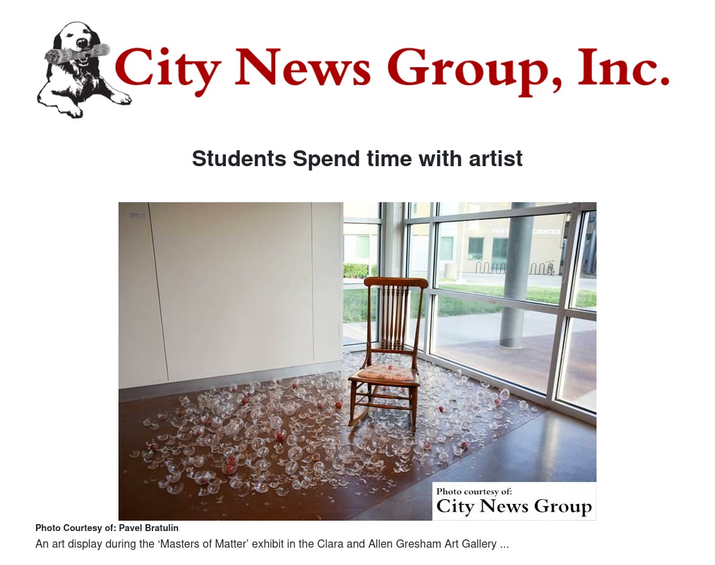 The “Masters of Matter” exhibit in the Gresham Art Gallery ran from March 20 to April 7, and featured glass and ceramic art by Straubing, the glass faculty head and studio coordinator at San Jose State University, and Lin, who has nearly 50,000 subscribers to his YouTube page. Straubing conducted a one-day workshop, while Lin spent three days working with the students. Stewart publicized the workshops on EventBrite, and some of Lin’s fans from as far away as Pennsylvania flew out to attend. About 150 SBVC students participated, as well as local high schoolers and students from other colleges.