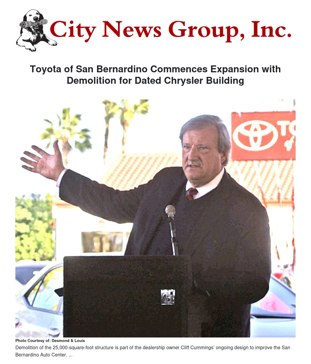 On the afternoon of Wednesday, Oct. 30, Toyota of San Bernardino took a wrecking ball to the former Shaver Chrysler dealership as phase one of the dealership’s expansion and renovation plans. Demolition of the 25,000-square-foot structure is part of the dealership owner Cliff Cummings’ ongoing design to improve the San Bernardino Auto Center. Elected officials, members of the media and local residents joined Toyota of San Bernardino for a short presentation followed by the demolition and fireworks show.