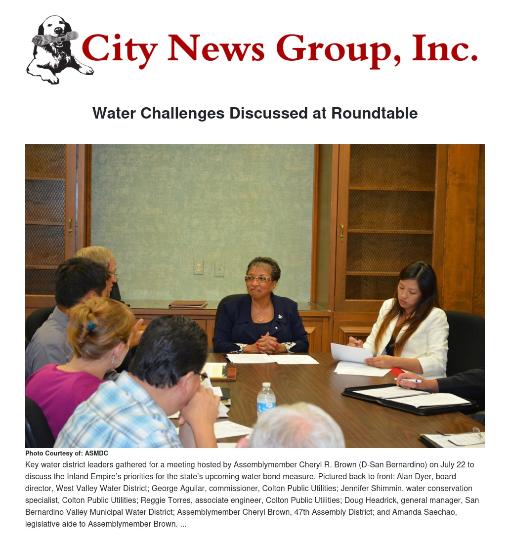 Key water district leaders gathered for a meeting hosted by Assemblymember Cheryl R. Brown (D-San Bernardino) on Tuesday, July 22, to discuss the Inland Empire’s priorities for the state’s upcoming water bond measure.
