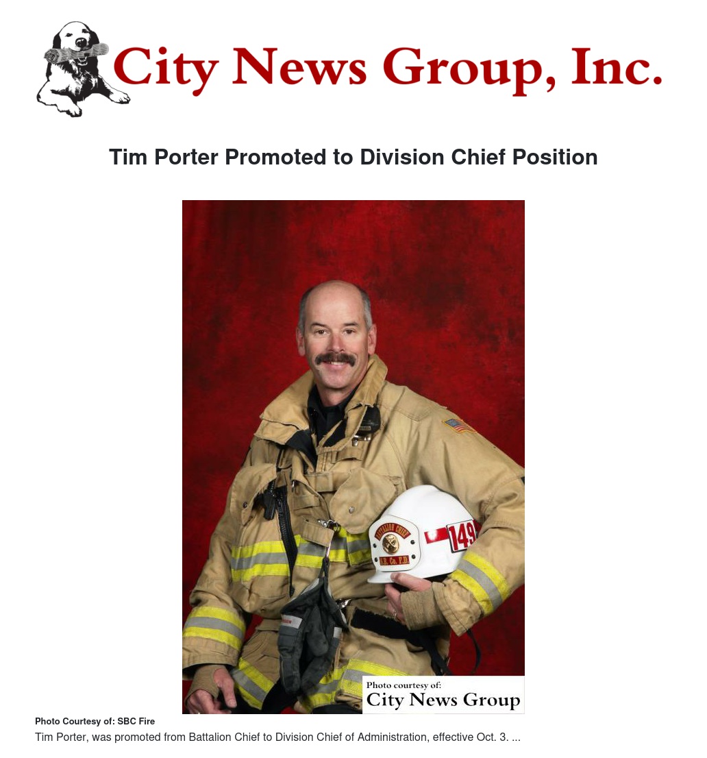 SAN BERNARDINO>> San Bernardino County Fire Chief Mark Hartwig recently announced the promotion of Tim Porter from Battalion Chief to Division Chief of Administration, assigned to Department Headquarters in San Bernardino effective Oct. 3, 2016.