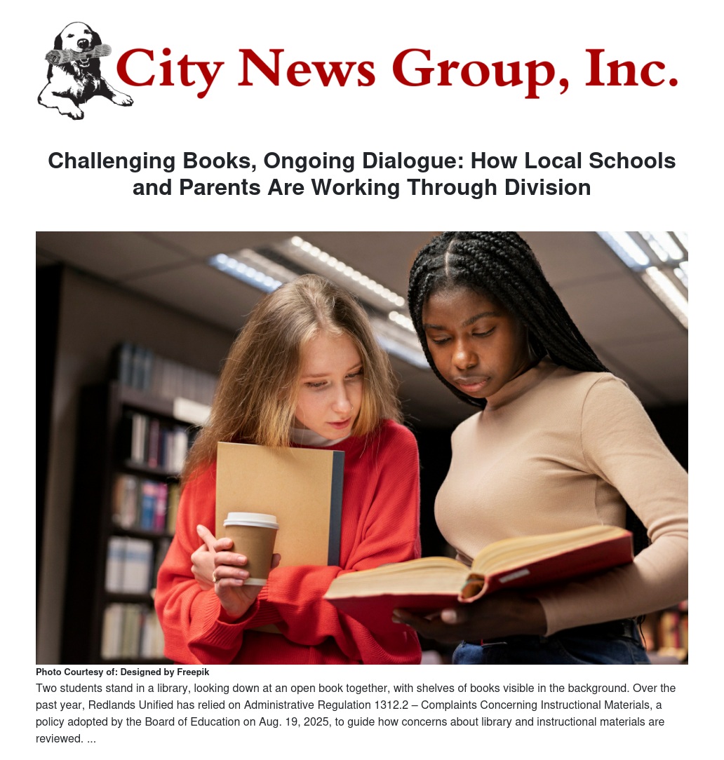 Over the past year, Redlands Unified has relied on Administrative Regulation 1312.2 – Complaints Concerning Instructional Materials, adopted by the Board of Education, on Aug. 19, 2025, to guide the review of concerns about library and instructional materials. The policy outlines a step-by-step process that begins with a formal complaint reviewed by the school principal, followed by evaluation by a district committee using a standardized rubric, and allows for a public board hearing if the decision is appealed. District officials have described the policy as an effort to bring clarity, consistency, and transparency to an issue that often generates strong emotions.