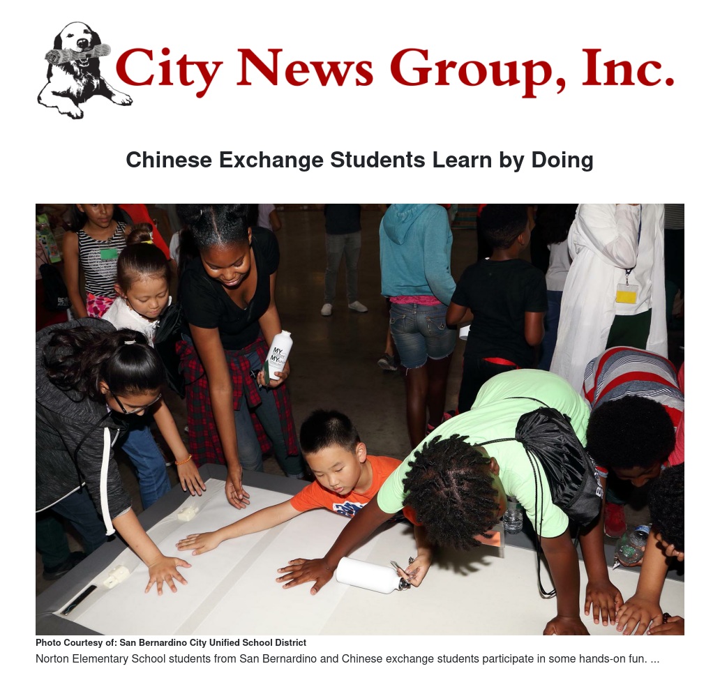 The program, thought to be the first of its kind for foreign exchange students in elementary school, is the culmination of two years of collaboration between Cochrane-Benoit and Guohai “Jack” Tang, the CEO of Chinese high-tech company Keeson Technology Corporation. The seven children who traveled more than 6,000 miles to San Bernardino are the children of Keeson employees, some of whom work as engineers and utilize the very state-of-the art technology that Norton students use in class. The exchange program, which was jointly funded by SBCUSD, Keeson, and the families of the exchange students, began on July 16 and ended July 28.