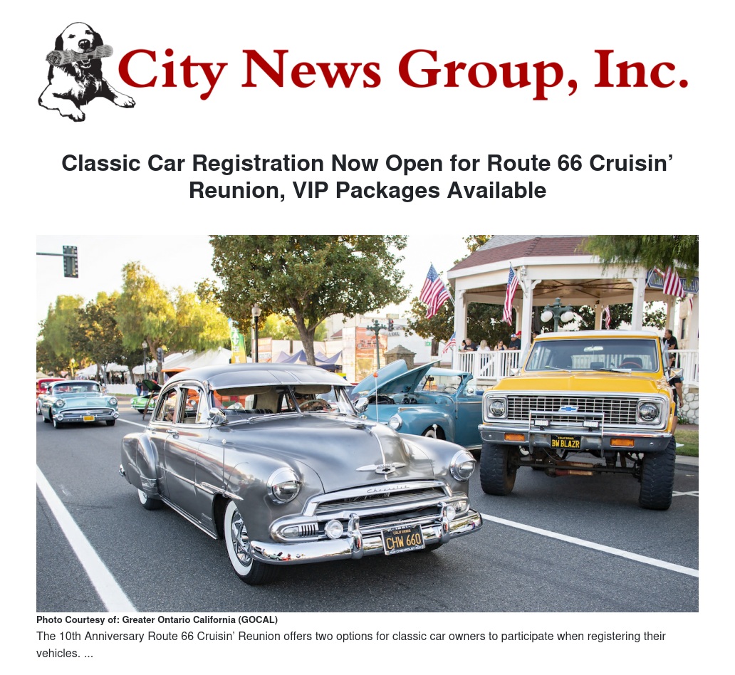 Route 66 Cruisin’ Reunion, powered by Greater Ontario California (GOCAL), has announced the opening of online classic car registration.