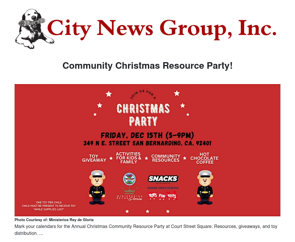 Community Christmas Resource Party! Join us for a festive gathering at Court Street Square on Fri Dec 15, 2023 at 5:00 PM. This exciting event aims to bring our community together in celebration of the holiday season. Get ready for an evening filled with joy and merriment! Our Community Christmas Resource Party offers a wide range of activities and resources for everyone to enjoy.
