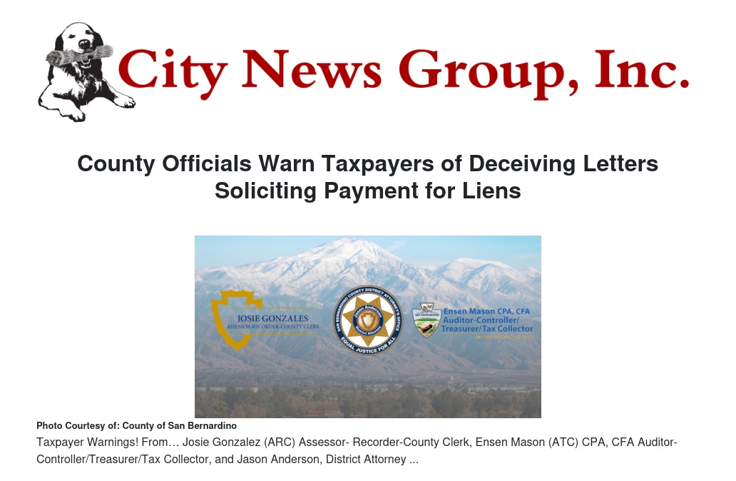 Residents who have received such letters or suspects fraud should be cautious before paying demands. If you require further assistance, please visit the Assessor-Recorder-County Clerk’s website at arc.sbcounty.gov or contact (909) 387-8306, or the Auditor-Controller/Treasurer/Tax Collector at mytaxcollector.com or (909) 387-8308.
