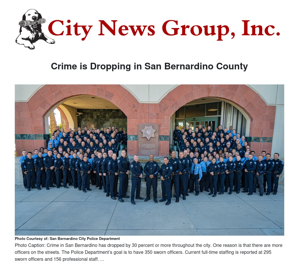 “Crime rates in San Bernardino County have decreased by almost half over the past five years,” said Police Chief Darren L. Goodman. “This positive trend includes a decline in burglaries, aggravated assaults, and, notably, there have been very few homicides this year.” Crime rates in the rest of the City have also declined by more than 30 percent.