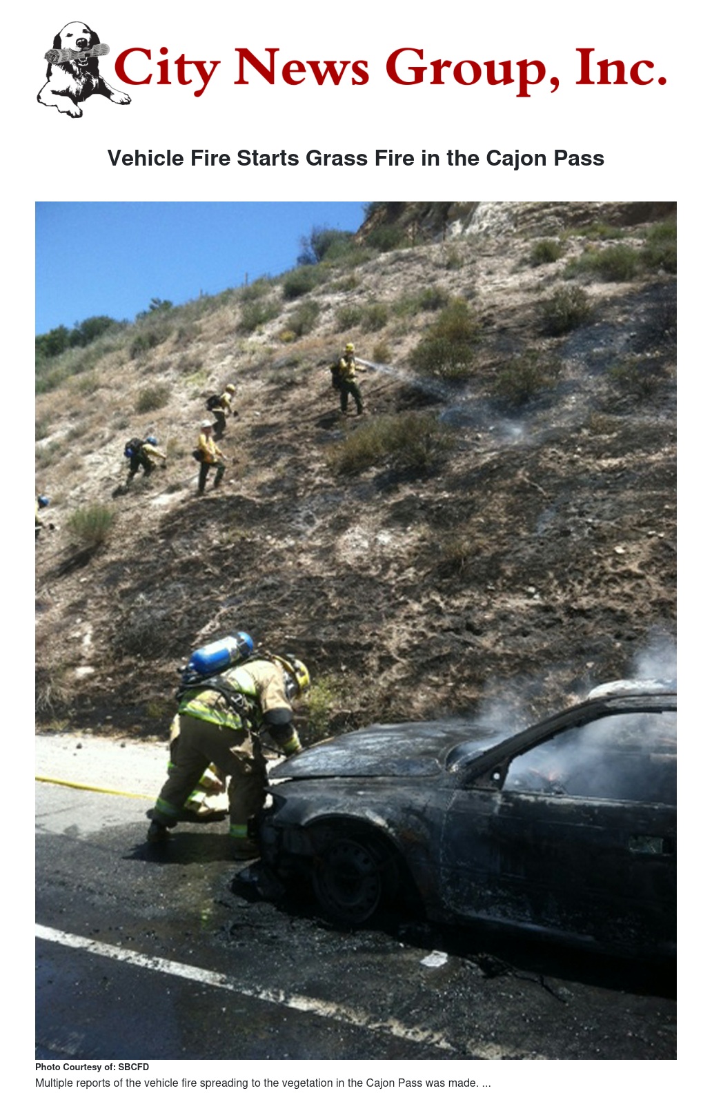 The San Bernardino County Fire Department was dispatched to a vehicle fire at the above listed time and location. The responding units were advised that multiple reports were being received that a vehicle fire had spread to the vegetation in the Cajon Pass.