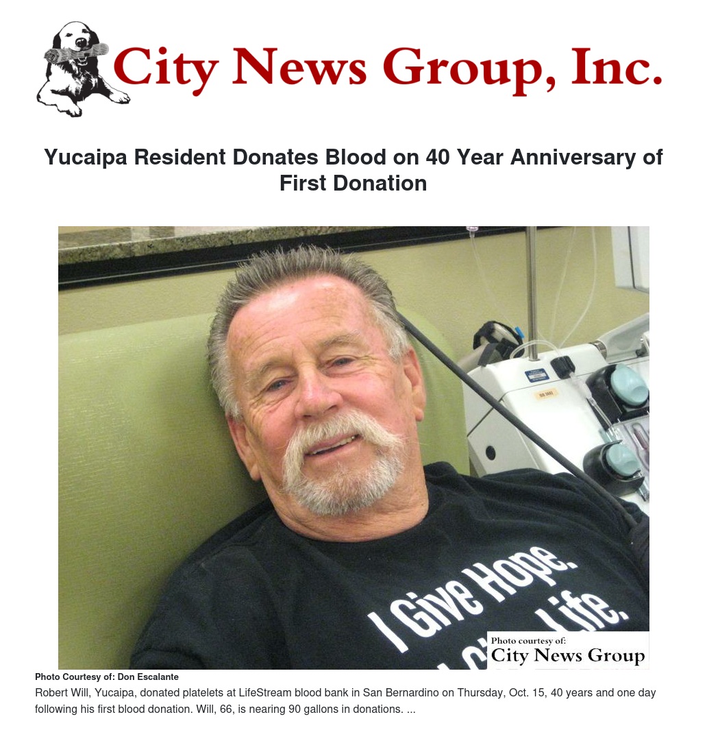 On Thursday Oct. 15, he marked the 40th anniversary of that first blood donation by making a platelet donation at LifeStream’s San Bernardino Donor Center, 384 W. Orange Show Road.
