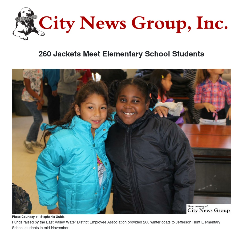 EVWD employees delivered 260 winter coats to students at Jefferson Hunt Elementary School Wednesday, Nov. 18.