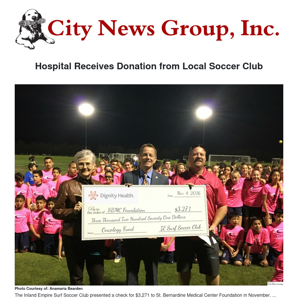 “A diagnosis of breast cancer can be trying for patients and their families – physically, emotionally and financially,” said Dan Murphy, Vice President of Philanthropy at Dignity Health - St. Bernardine Medical Center Foundation. “This gift will allow our patients to receive something that will assist them as they recover. All of us at St. Bernardine are extremely thankful to the children and families from the Inland Empire Surf Soccer Club for their generosity and kindness.”