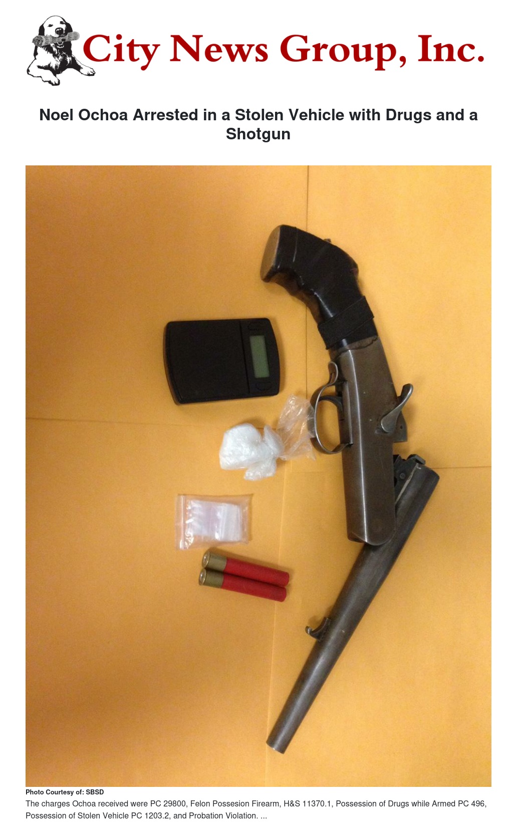 On Saturday, September 30th, deputies from the Central Patrol Station located a stolen 1993 Honda Accord in the parking lot of a restaurant. Deputies remained in the area until the occupants returned to the vehicle. The driver, Noel Ochoa, attempted to flee on foot, but injured his hand attempting to go over a chain link fence to the adjoining property. Ochoa was taken into custody without further incident. Ochoa had a No Bail warrant for a different possession of a stolen vehicle case. During a search of the stolen vehicle, a loaded 410 sawed off shotgun and a large quantity of methamphetamine was located in the trunk of the stolen vehicle.