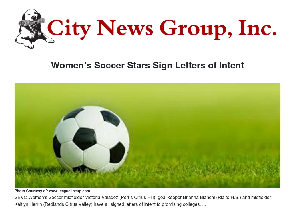 SBVC Women’s Soccer midfielder Victoria Valadez (Perris Citrus Hill), goal keeper Brianna Bianchi (Rialto H.S.) and midfielder Kaitlyn Herrin (Redlands Citrus Valley) have all signed letters of intent, with Valadez heading to Prairie View A&M, Bianchi going to Nyack and Herrin making her way to East Central.