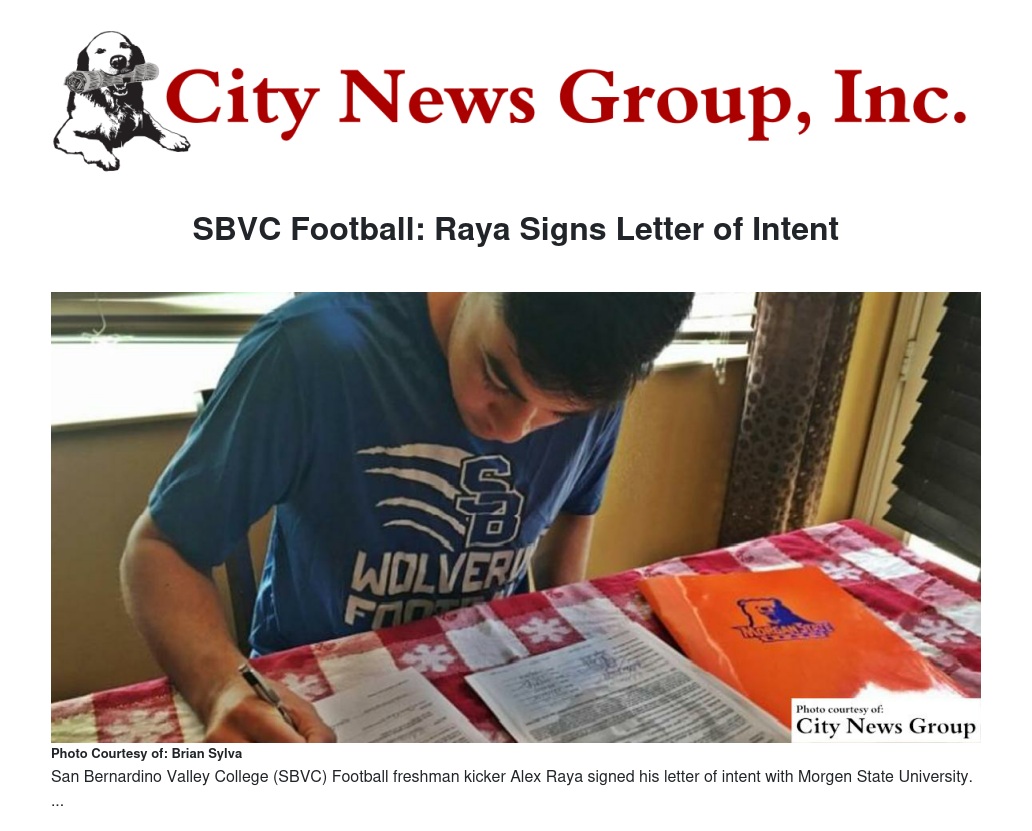 San Bernardino Valley College (SBVC) Football freshman kicker Alex Raya (Beaumont H.S.) has signed his letter of intent with Morgan State University.