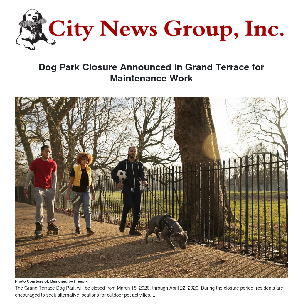 Dog Park Closure Announced in Grand Terrace for Maintenance Work by Eric Montgomery - City News Group, Inc.
