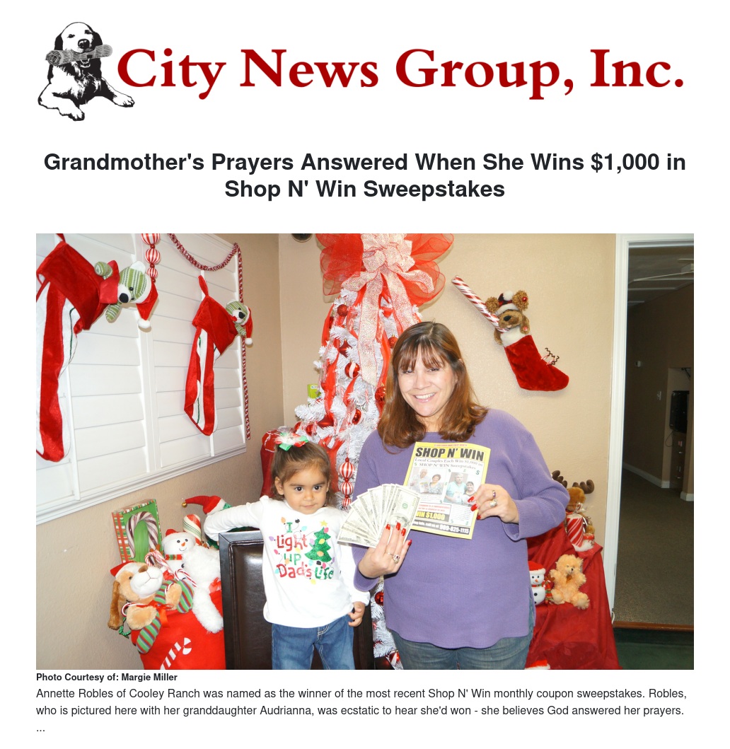 Annette Robles, of Cooley Ranch, was crying incredulous tears of joy as she drove all the way home: God had answered the prayers of the mother of three and grandmother of five when she was told she had just been named the winner of the most recent Shop N' Win monthly coupon book sweepstakes and would take home the $1,000 grand prize. Recent financial times were tough, and Robles was struggling with the burden of having to come up with an extra $600 to cover rent and other expenses.
