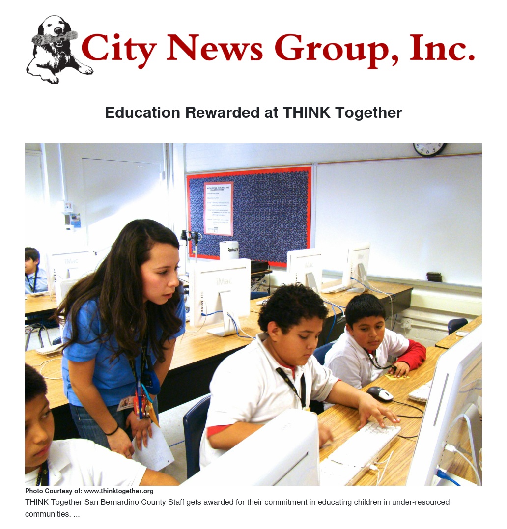 By staying committed to the children, THINK Together has established out-of-school programs that have provided educational resources for children. By teaming with public and private schools, THINK Together has expanded in order to reach out to several communities in the counties of Los Angeles, Orange, Riverside, Sacramento, San Bernardino and San Diego.