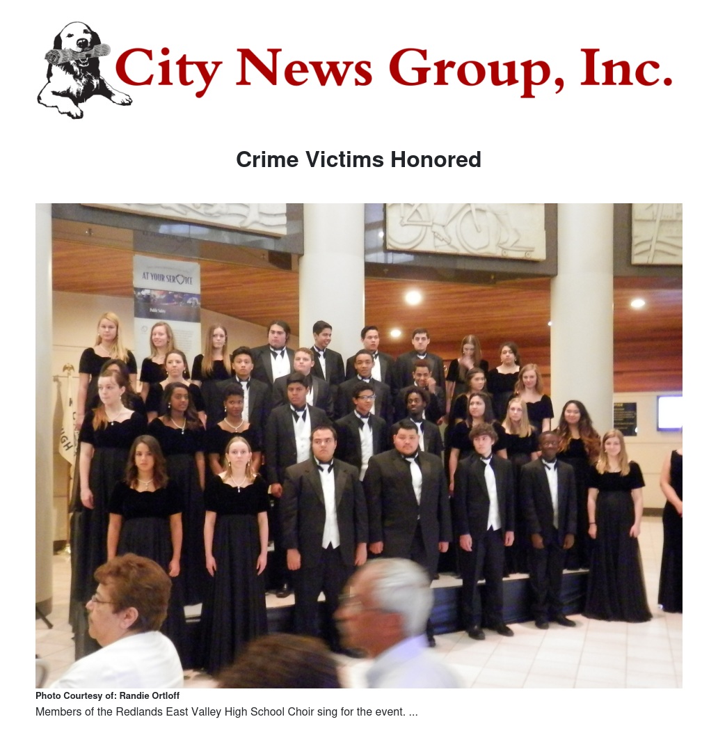 The hour long event also featured members of the Redlands East Valley High School Choir – under the direction of Rita Stephens and Dr. Ed Yarnell – performing songs of tribute and reflection. Community organizations dedicated to providing resources and programs for victims set up outside the county building to share valuable, life-saving information about support groups and shelters in the area. Organizations such as Project Sister and Children’s Assessment Center aim at protecting abused women and children by offering them counseling and self-defense workshops. The organization Parents of Murdered Children was just one of the many booths present at the event. This particular organization offers ongoing support to the friends and families of those who have lost loved ones to violence. Agnes Gibboney and Faye Jenkins are two members of the Inland Empire chapter of the group. The murder of their children brought Gibboney and Jenkins together, and since their loss they have dedicated themselves to helping others through the grieving process. As expressed by Gibboney, the heartache of losing a child cannot be understood until experienced firsthand. “Before my son’s murder I used to feel sorry for parents who lost a child,” explains Gibboney, “but I didn’t understand it until it was my son that was murdered. If I could sacrifice my life so that no other parent had to experience the pain that I have experienced then I would do it, in a heartbeat.”
