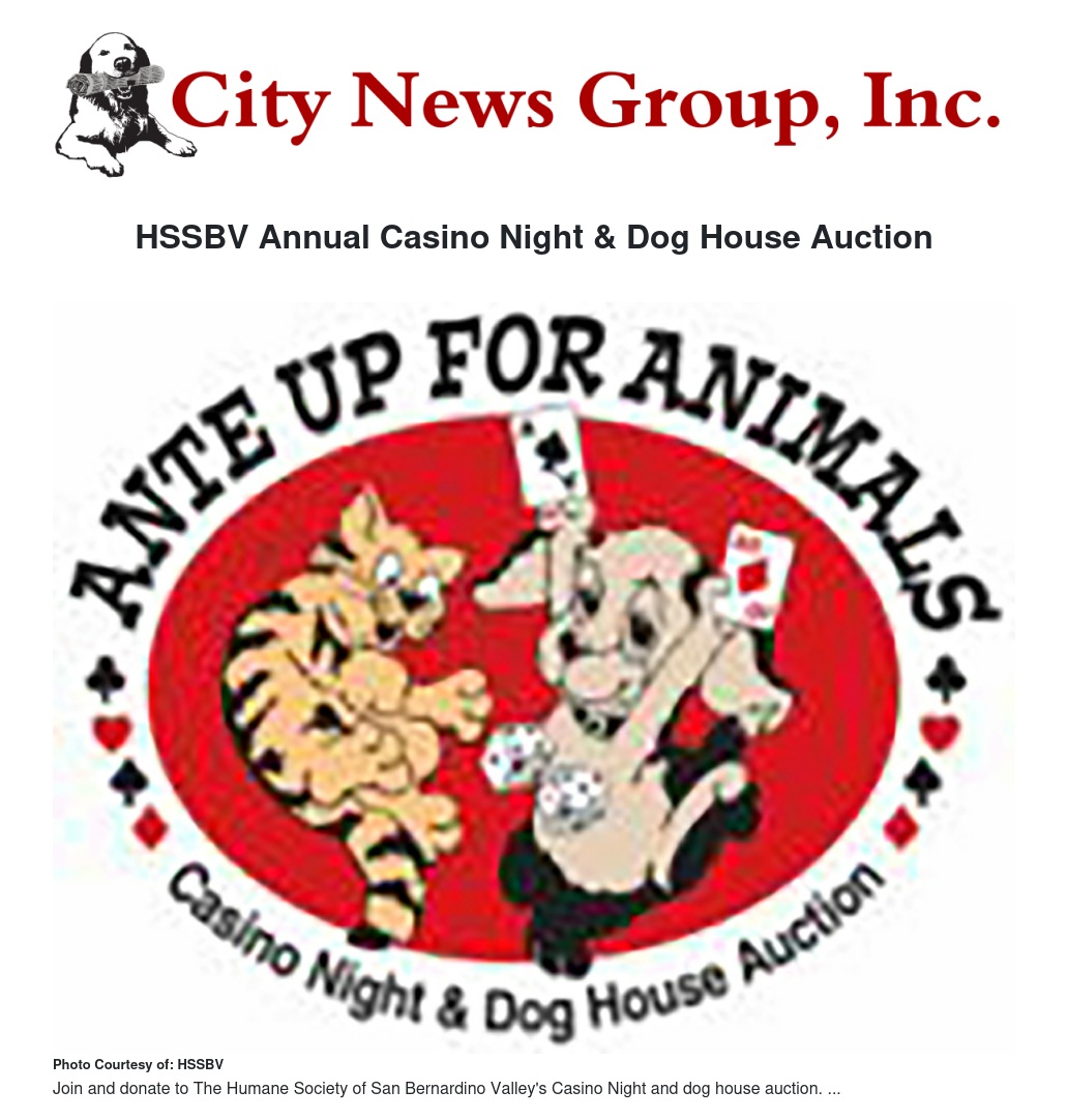 Sponsors for Ante Up for Animals Casino Night and Dog House Auction include Subaru of San Bernardino, FrontLine Plus, Boehringer-Ingelheim, Jordan Insurance-An Empire Company, Security Bank of California, Blue Buffalo, Bayer, Fairview Ford Sales, Inc., Wells Fargo Advisors, LLC, Gresham Savage Nolan & Tilden, PK Design and SC Printwerks. All proceeds from this event benefit the HSSBV programs and services.