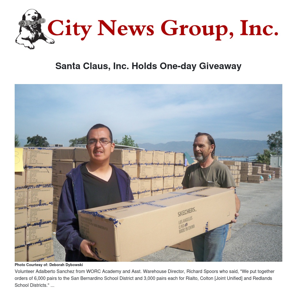 Santa Claus, Inc. didn't wait until Christmas to give out these shoes to those in need. On Wednesday, April 23rd, students from WORC Academy, San Bernardino Valley College joined volunteers to load and sort the pallets of merchandise.