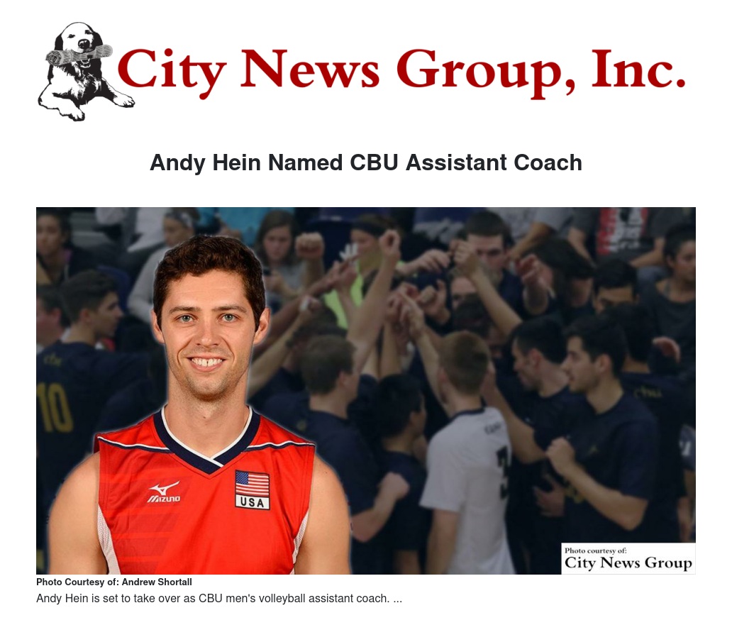 Andy Hein will take over as the California Baptist University men's volleyball assistant coach after Derek Schmitt took over the head coaching responsibilities this summer, as announced by Director of Athletics Dr. Micah Parker.