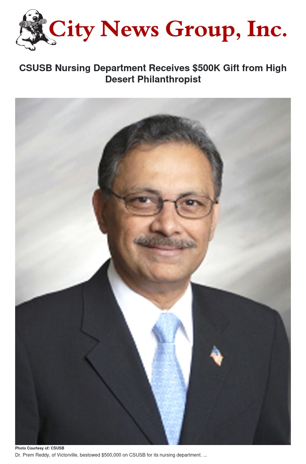 Physician and philanthropist, Dr. Prem Reddy, of Victorville, has donated $500,000 to Cal State San Bernardino (CSUSB) and its department of nursing. To recognize his gift, the university’s nursing lab will be renamed the Dr. Prem Reddy Nursing Laboratory.
