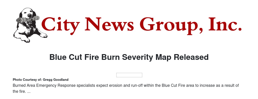 Blue Cut post-fire BAER assessment information is available at the InciWeb site. The soil burn severity map can be downloaded as a JPEG or PDF version from the “maps” tab.