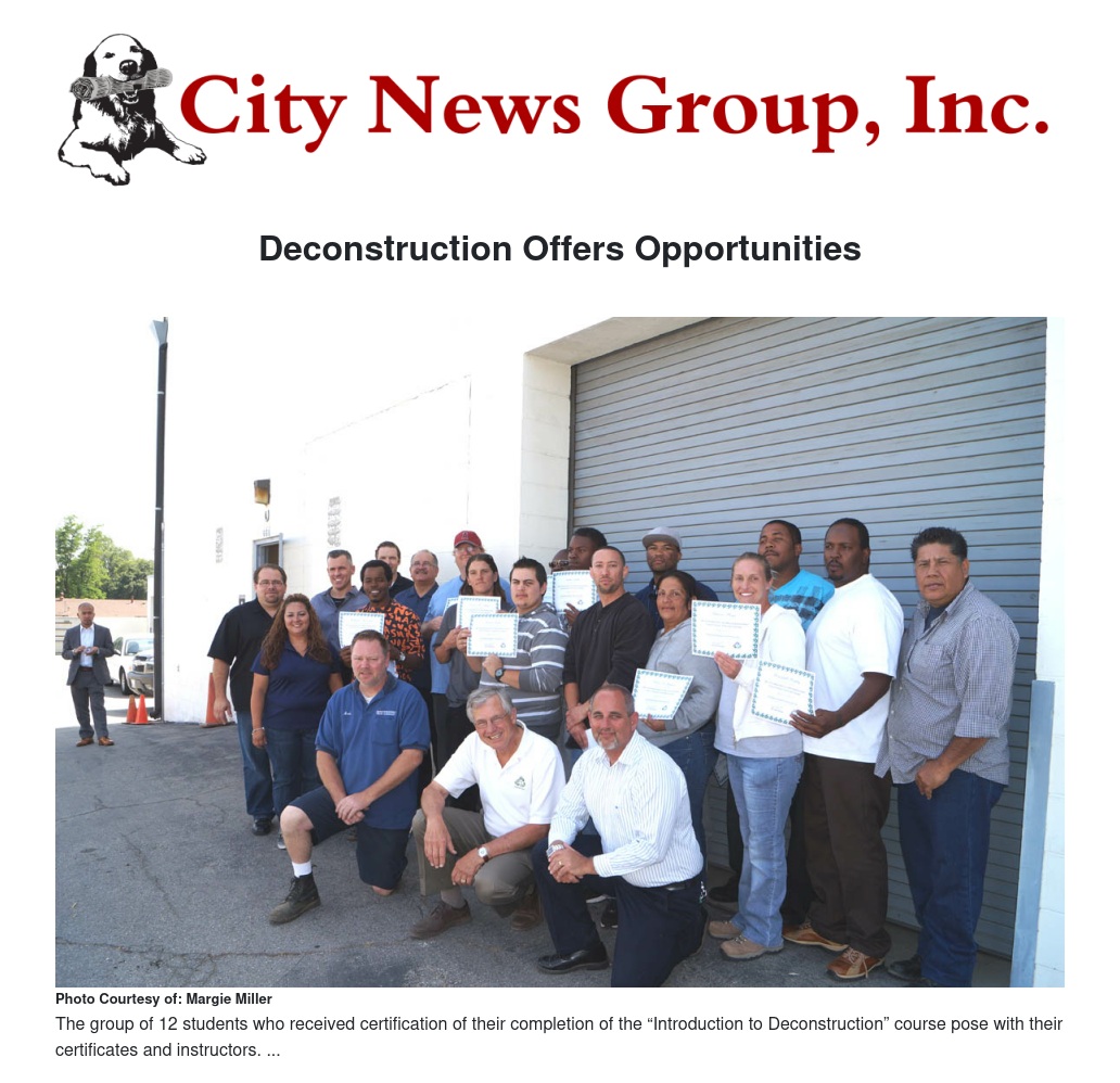 Applicants from various walks of life were accepted into the program, which certifies students on building deconstruction, an environmentally-friendly alternative to demolition in which trained deconstruction crews deconstruct buildings to salvage reusable materials, ultimately diverting the materials away from placement into local landfills. These materials often include doors, windows, cabinets, lighting and plumbing fixtures, framing lumber, roofing materials and floorings.