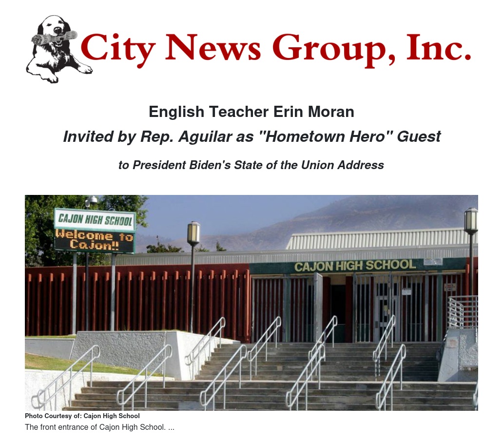 Rep. Pete Aguilar today invited Erin Moran, an English teacher at Cajon High School in San Bernardino to be his “Hometown Hero” virtual guest to President Biden’s State of the Union Address to Congress.