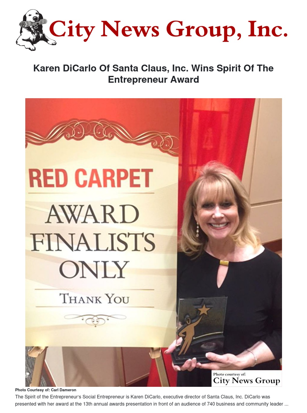 Karen DiCarlo Of Santa Claus, Inc. Wins Spirit Of The Entrepreneur Award