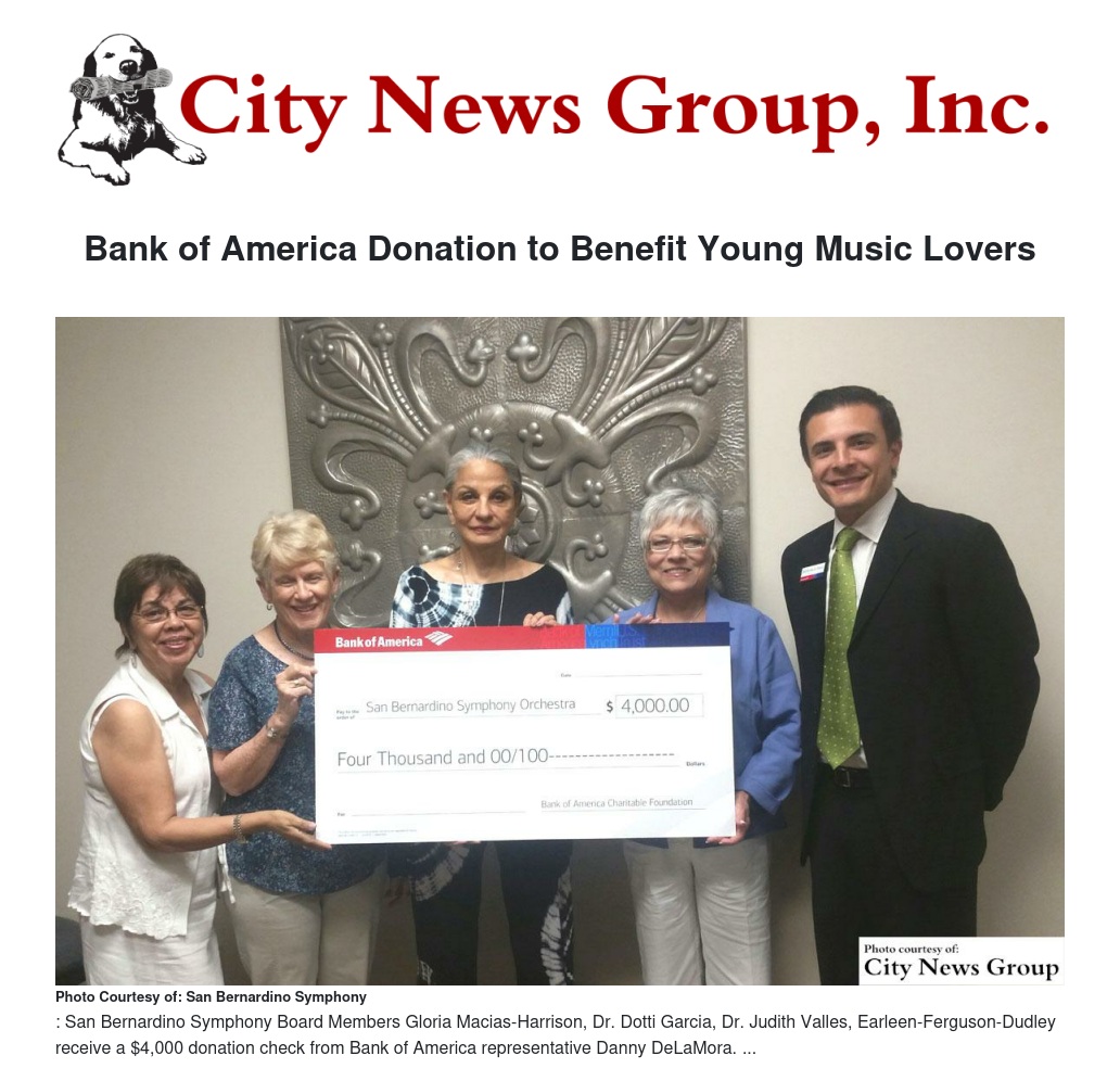 The San Bernardino Symphony was the recent recipient of a $4,000 donation from Bank of America in support of programs benefitting local youth.