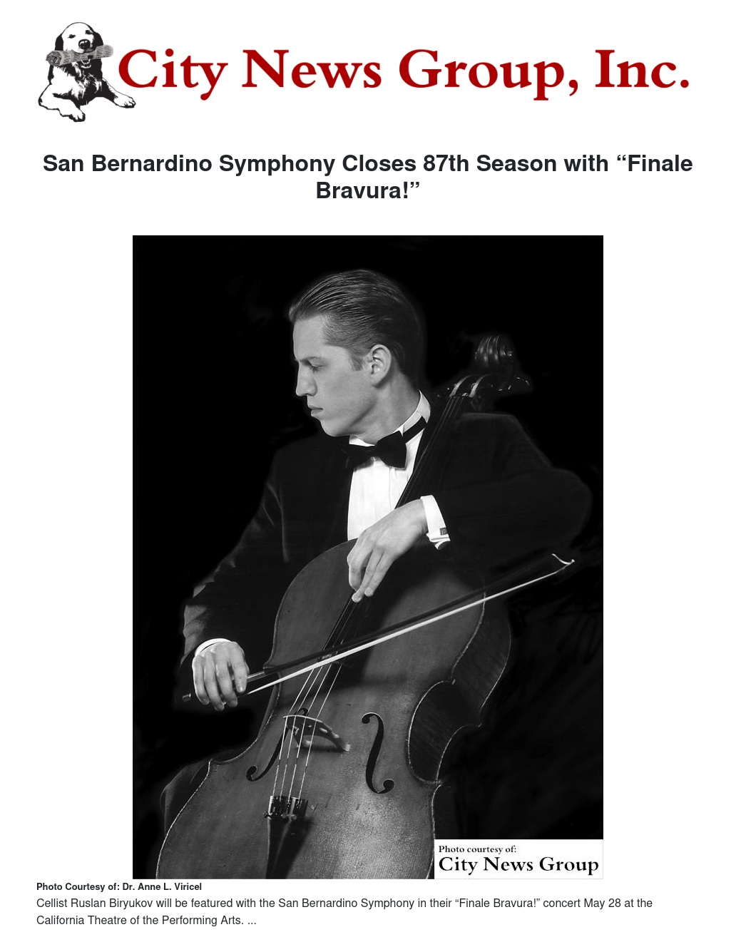 Those interested in a glimpse of cellist Biryukov’s artistry are invited to attend a pre-concert Musicale sponsored by the San Bernardino Symphony Guild. The event will be held Friday, May 27 at 7 p.m. at the San Bernardino Garcia Center for the Arts located on the corner of E and 11th Streets. Tickets are $40 and may be obtained by calling (909) 496-6022.