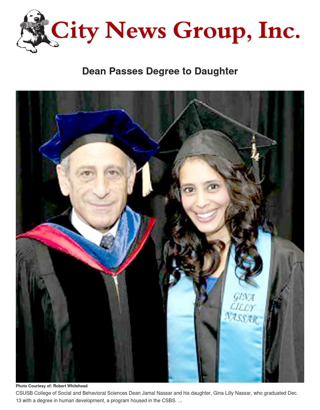 Aside from being a proud parent, the ceremony had special meaning for Nassar, who serves as dean of the CSUSB College of Social and Behavioral Sciences. Gina was graduating from his college, with a bachelor’s degree in human development.