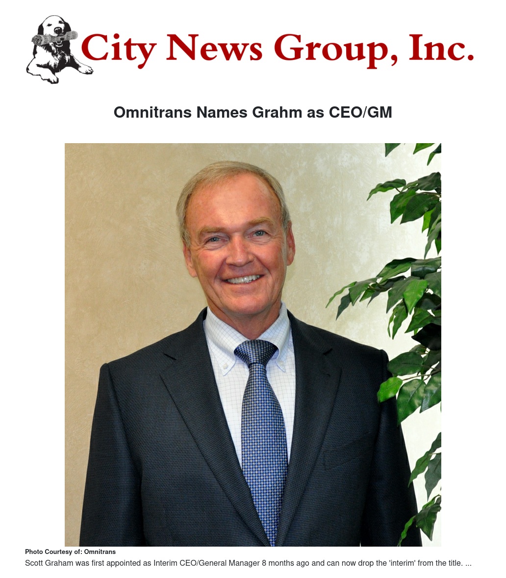 The Omnitrans Board of Directors appointed Scott Graham as CEO/General Manager effective February 5, 2014, eliminating “interim” designation from his title after eight months on the job.