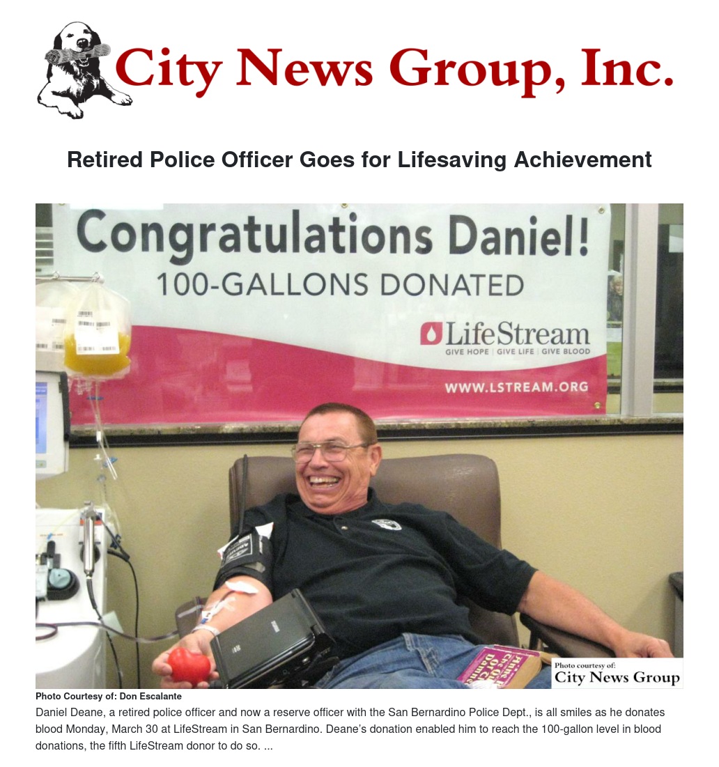 Daniel Deane, a retired San Bernardino police officer, made a lifesaving achievement on Monday, March 30, when he rounded out the "starting five" of Lifestream blood donors to reach 100 gallons in blood donations.