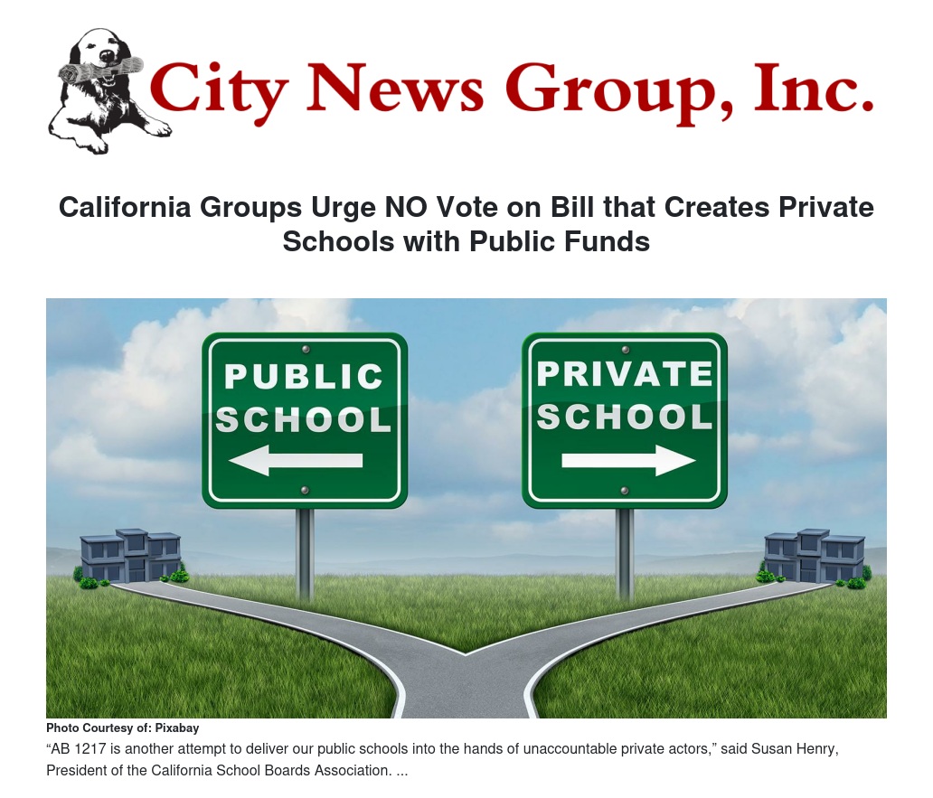 “AB 1217 is another attempt to deliver our public schools into the hands of unaccountable private actors,” said Susan Henry, President of the California School Boards Association. “There are plenty of ways to establish new schools under existing law, but instead of using one of them, this bill sets a precedent that undermines local control of public schools. We encourage the Legislature to defeat AB 1217 and to focus on supporting and strengthening all public schools.”